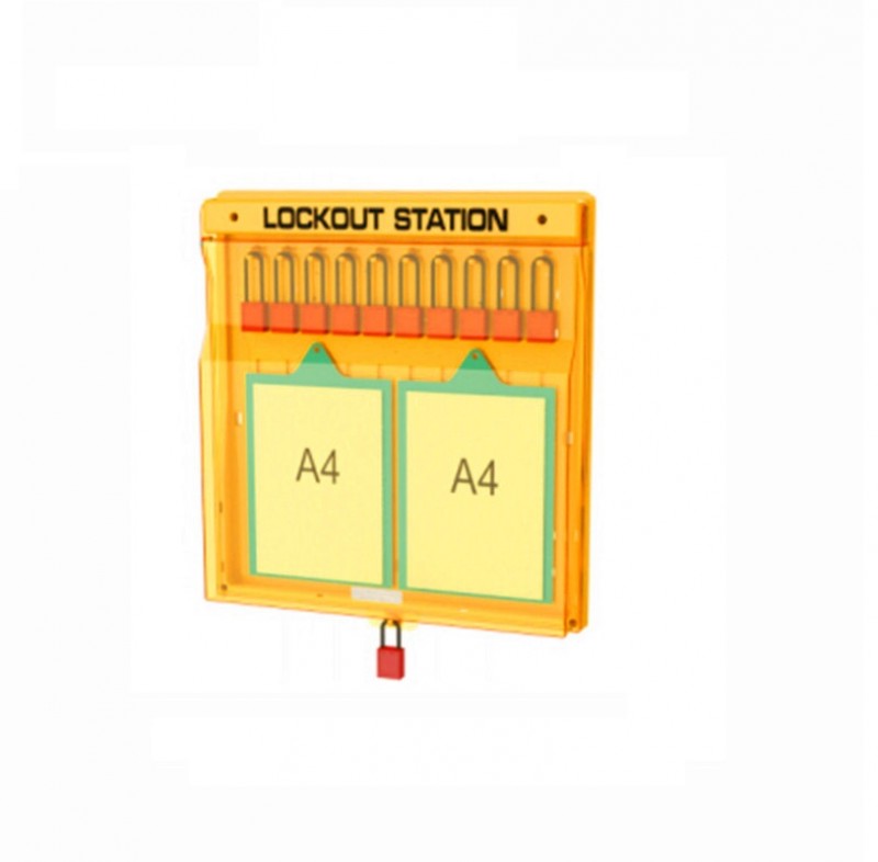 Станция закрытого типа для хранения LOTO замков с прозрачной крышкой. Вмещает 10-20 навесных замка и 2 планшета формата A4. Можно хранить замки как с короткой, так и с длинной дужкой 76 мм. Изготовлена из прочного пластика, закрывается на навесной замок. Станцию без крышки можно заказать под артикулом BD-B206W.
